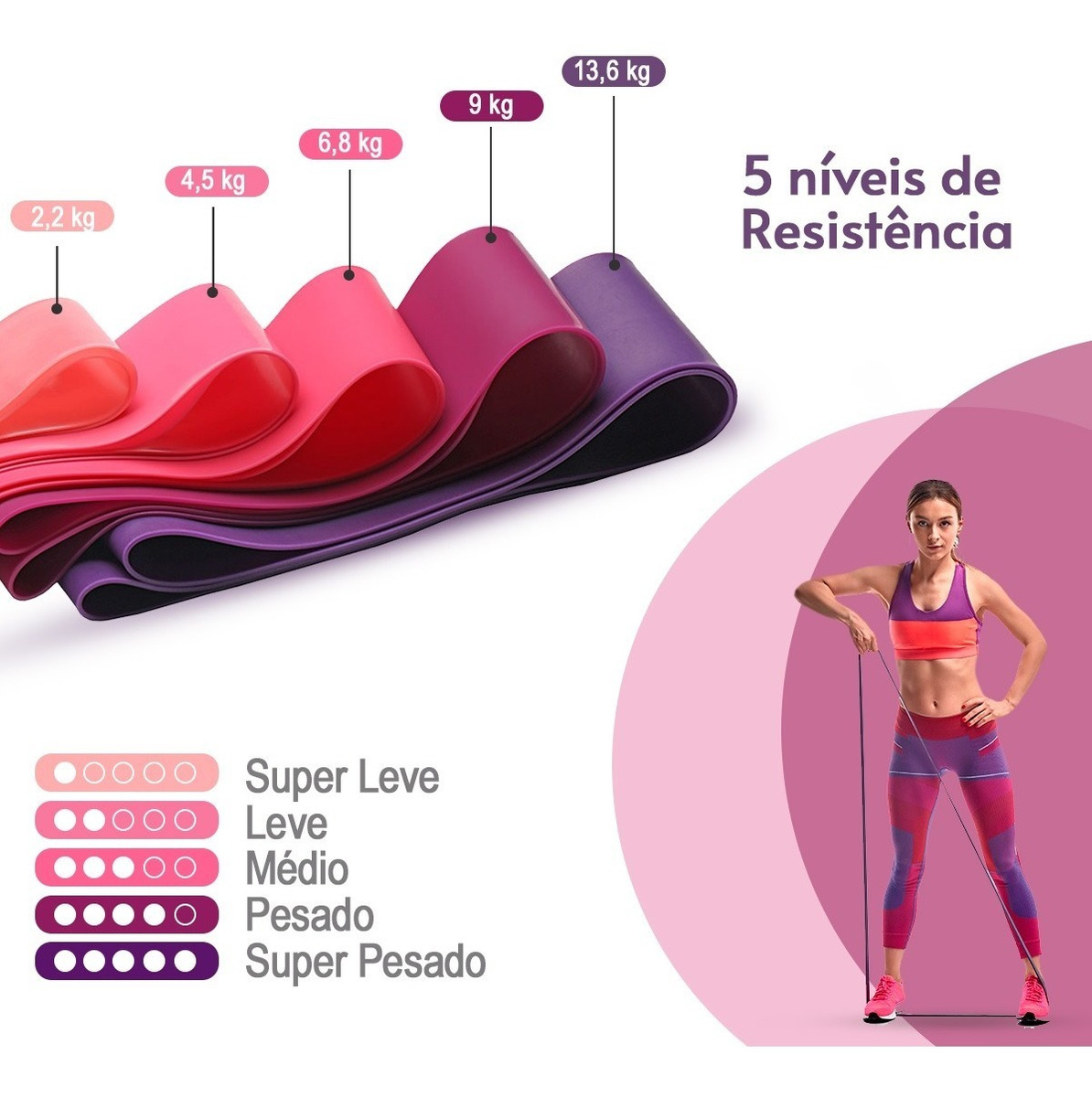 Potencialize seus resultados com o Kit 5 Mini Bands Rosa. Cinco níveis de resistência em tons degradê para um treino completo de glúteos, pernas e braços. Estilo e performance em qualquer lugar!